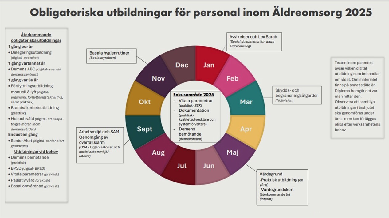 Detta hjälper oss att planera, följa upp och kvalitetssäkra vår gemensamma kompetensutveckling inom Särskilt boende Väster. Med detta årshjul skapas struktur och kontinuitet i lärandet.